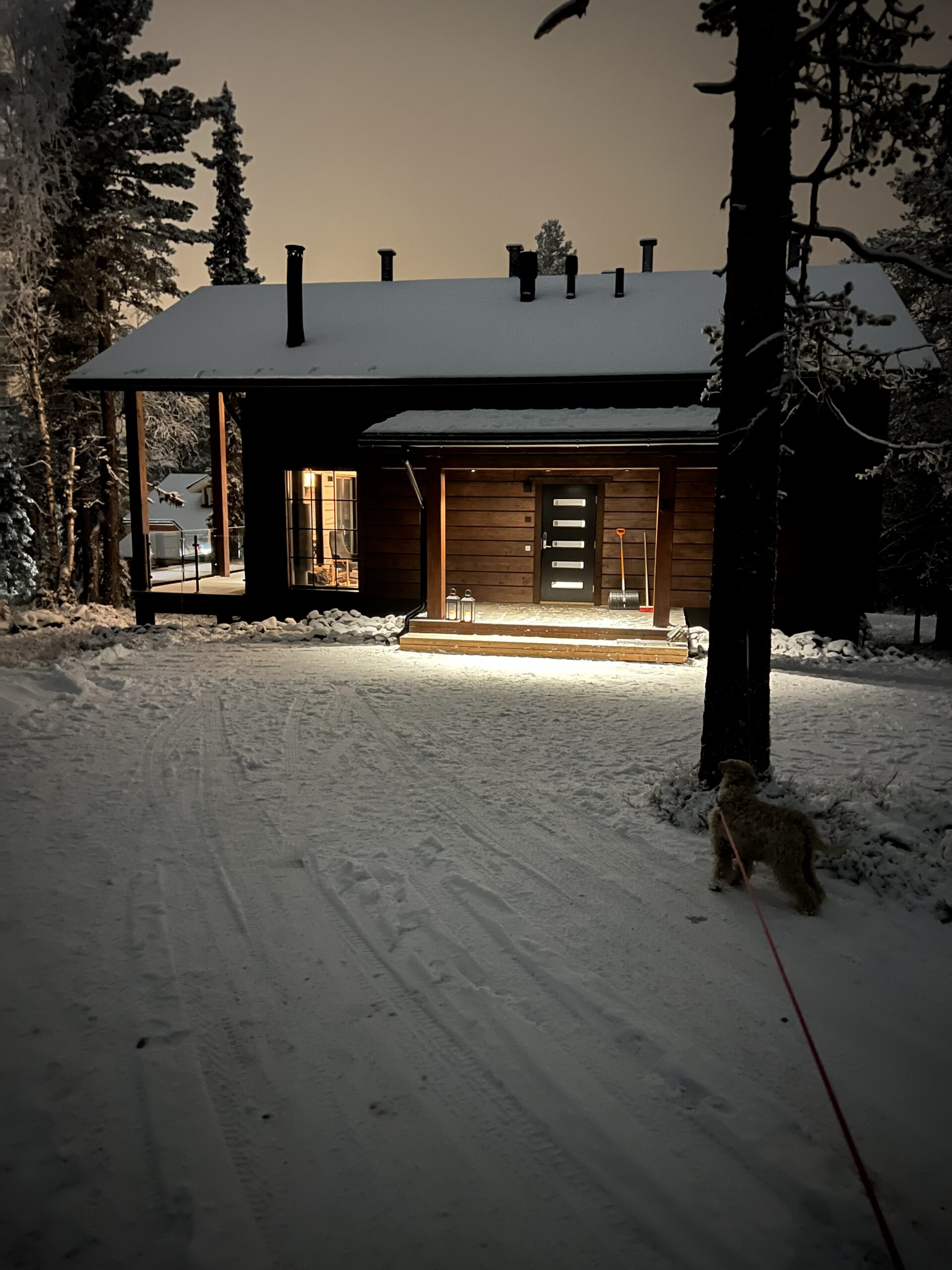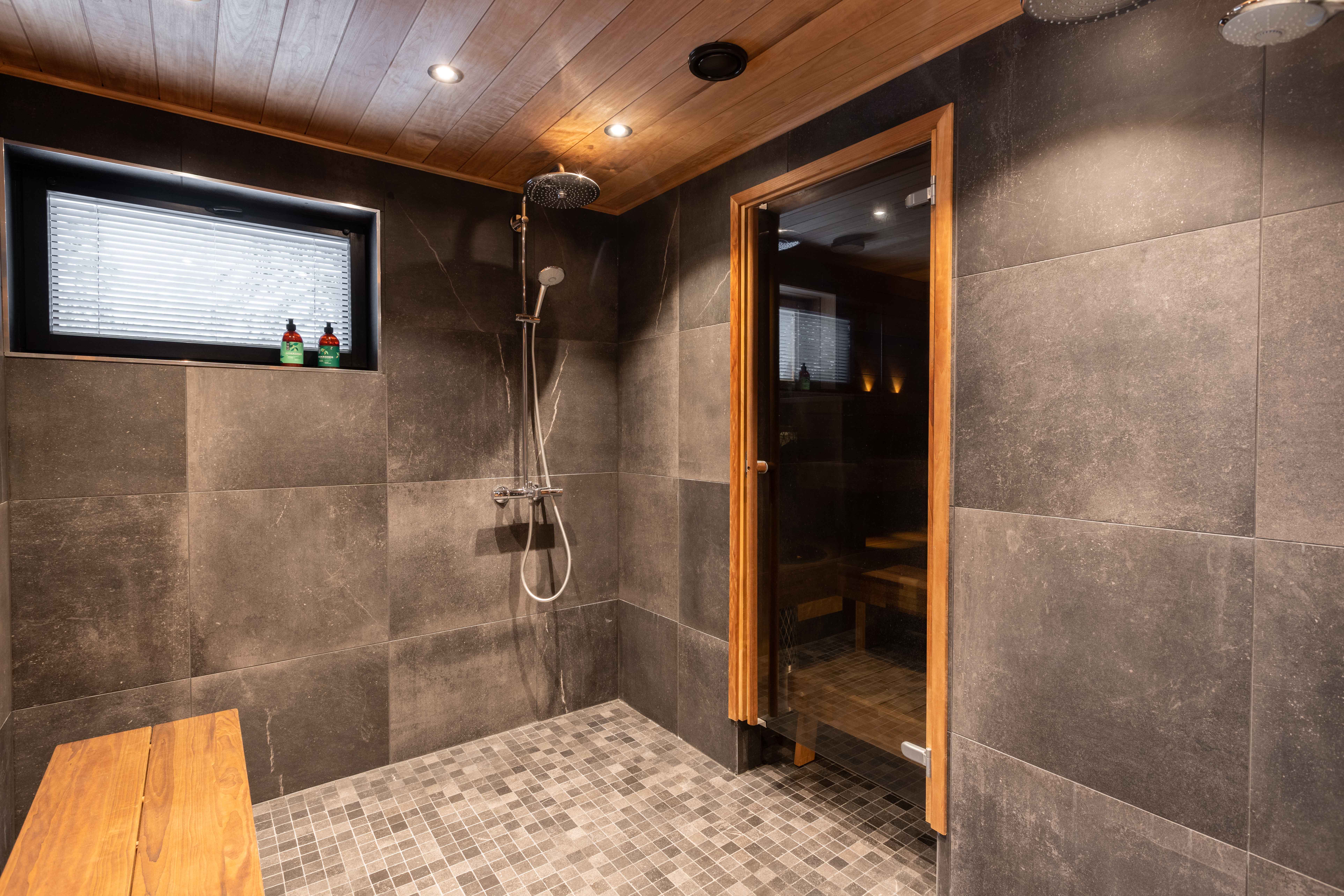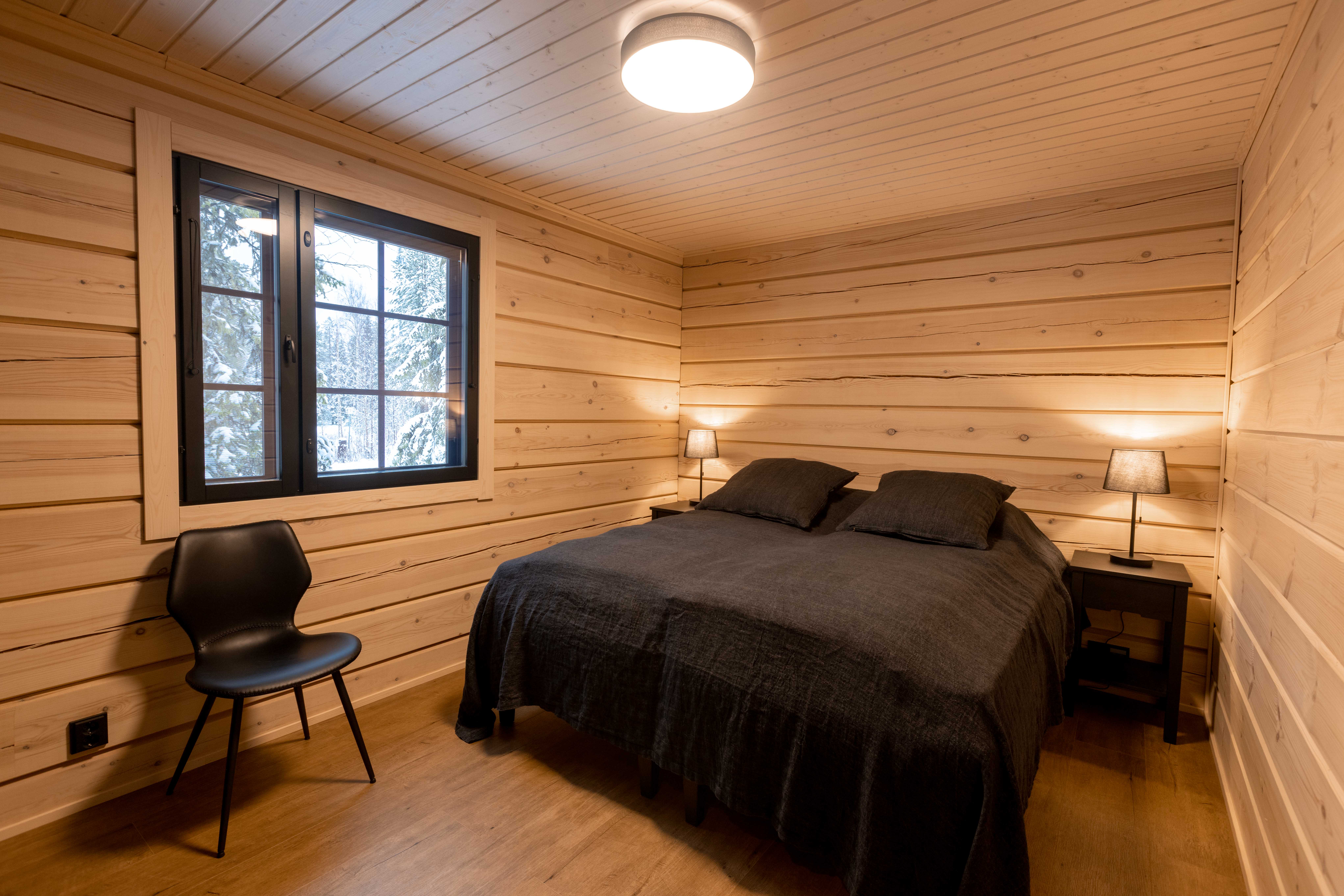 Ihanat oikeat massiivihirsiseinät, kiiltävää kaunista laattaa, tyylikästä mattamustaa ja tietysti Lapin luonto isoista ikkunoista.